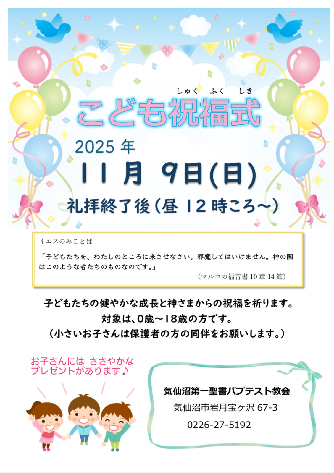 子ども祝福式 開催のおしらせ 2025 10/28 お知らせ 11月9日(日)の礼拝後に、子どもたちの健やかな成長と祝福を祈る〝こども祝福式〟を行います。対象は、0歳〜18歳の方です。参加したお子さんにはささやかですがプレゼントがあります♪参加は無料です。教会に来られるのが初めての方も歓迎します! お知らせ 「久米小百合さんと共に 能登半島復興チャリティ音楽会」開催! 11月23日(日) 主日礼拝 講壇交換のお知らせ 関連記事 天窓通信(牧師室から)UPしました! 2025年11月11日 11月23日(日) 主日礼拝 講壇交換のお知らせ 2025年10月28日 「久米小百合さんと共に 能登半島復興チャリティ音楽会」開催! 2025年10月16日 キャサリン・ポーター ハープコンサート 開催♪ 2025年6月21日 6月15日(日) 主日礼拝のお知らせ 2025年5月15日 2025年6月8日ペンテコステ(聖霊降臨)記念礼拝 開催 2025年5月15日 GO TOミッション2025コンサート 開催 2025年5月10日 コールサムエル・ミニコンサート2025 開催 2025年5月3日